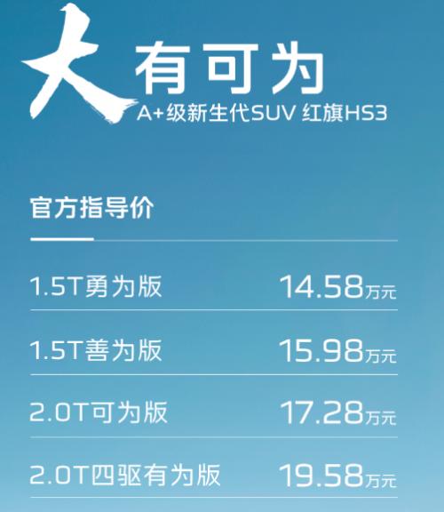 7月17日,一汽红旗公众号发布消息,红旗HS3正式上市,售价14.58-19.58万元。