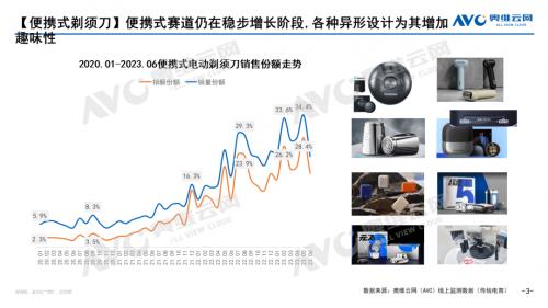 便携式电动剃须刀主要有两类人群使用,一个是差旅商务人群,作为生活中的第二把剃须刀,另一类是年轻群体,解决第一把剃须刀的使用问题。和高速电吹风不同,便携式电动剃须刀不存在技术壁垒问题,无非就是将体型做小,因此品牌方开始在外观造型上面做创新。继小飞碟造型出圈后,各种异形设计进入市场,为产品增加趣味性,相继推出小锤子、行李箱、超跑等造型,部分品牌通过设计滑动开关、感应开关来增加互动性。