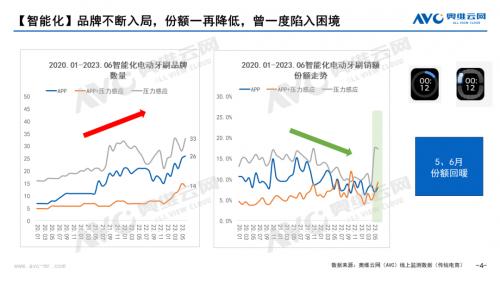此处的智能指的是app、压力感应以及app+压力感应三个类型,从奥维云网(AVC)监测数据可以看到智能电动牙刷品牌机型不断入局,但销额份额从2021年年底便呈现下降趋势,市场曾一度陷入困境。其中电动牙刷App使用频率低,消费者对于溢价的认可度不高为主要原因。将app功能搬到电动牙刷杆上,更加直观的看到刷牙动态,为电动牙刷智能化提供全新方向,2023年5到6月智能电动牙刷份额得到大幅增长。