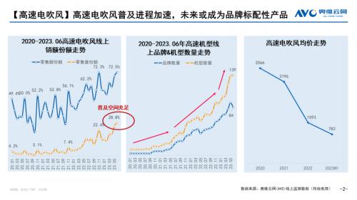 伴随消费需求升级,消费者对于高速电吹风的认可度提升,多个企业抓住红利推出新品,高速电吹风市场大爆发。从需求角度来看,2023年1-6月高速电吹风零售量份额仅20.2%也就是说电吹风消费者中仍有80%的人群未升级为高速电吹风,说明高速电吹风市场待普及空间十分充足。伴随着研发技术的日益成熟,高速电吹风价格也在不断下探,老品牌推出低价新机型,新品牌直击底价入场,2023年上半年高速电吹风均价仅为783元,相对比去年同期降低了41.3%,其中市面上不乏有299、399元产品推出,价格的下探既满足了消费者对于高性价比的追求,同时对于高速电吹风的普及起到了强有力的推动作用。