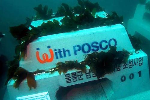 随着韩国渔业捕获量的日益减少,2009年,韩国海洋渔业部启动了一项海底种植计划,旨在2030年之前建成面积达5.4万公顷的海底森林。2000年,浦项制铁的科研部门与韩国产业科学研究院开展合作,共同研究用钢渣制造人工鱼礁石。由于钢渣是一种致密的岩石状材料,经常被用作铺设道路材料、建筑骨料或农业土壤添加剂。浦项制铁的科研团队意识到,钢渣富含天然矿物质,其所含的钙和铁对海洋植物的生长起到支持和保护作用。经过该公司科研团队的努力研究,人工鱼礁石Triton®砌块就此诞生。Triton®砌块由85%的钢渣骨料、15%的钢渣水泥和水组成。此外,Triton®砌块在被投放到海底之前,需要先植入海藻类植物,用于帮助先前大片荒芜的海岸线获得“新生”。自2007年以来,已有超过2.9万块Triton®砌块被投放在该国7500多处礁石群中。这些砌块能够有效帮助韩国沿海区域抵御台风或海啸等自然灾害。同时,附着在Triton®砌块上的海藻类植物能够高效捕获和封存水中的二氧化碳。