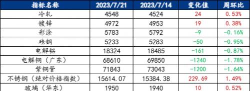 截止2023年7月21日,各原材料当日即时价格以及价格周环比情况如下: