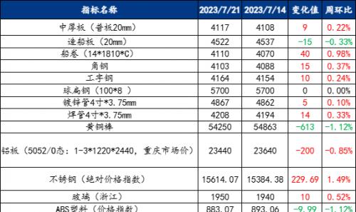 截止2023年7月21日,各原材料当日即时价格以及价格周环比情况如下: