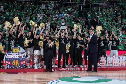 5月15日,辽宁本钢队在颁奖仪式上庆祝(如图)。当日,在辽宁沈阳举行的2022~2023赛季中国男子篮球职业联赛(CBA)总决赛第四场比赛中,辽宁本钢队以106比70战胜浙江稠州金租队,从而以4比0的总比分夺得总冠军,夺得队史第3座CBA总冠军奖杯。