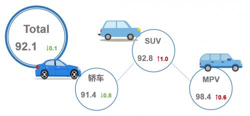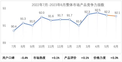 以2019年1月为基期,2023年6月整体市场产品竞争力指数为92.1,环比下滑0.1个点;从三大细分市场来看,轿车市场环比下滑0.8个点,SUV和MPV市场环比分别上升1.0和0.6个点。