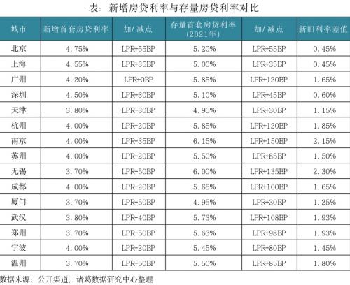 存量房贷利率与新增房贷利率之间的差距不断拉大,根据诸葛数据研究中心监测数据显示,重点15城当前新增首套房贷利率均降至5%以下水平,最低降至3.7%,而存量首套房贷利率基本都在5%以上,其中南京、无锡甚至高达6%以上,杭州、南京、无锡、武汉等城市LPR加点超过100BP,新旧利率差最高达到2.3%。