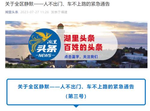 据厦门市湖里区人民政府办公室“湖里头条”微信公号消息,厦门市湖里区人民政府防汛抗旱指挥部发布《关于全区静默——人不出门、车不上路的紧急通告》,宣布从7月27日20时起,辖区所有市民居民居家避风,做到“人不出门、车不上路”。