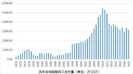新接订单量明显回升。2021年以来,世界新造船市场新船订单量大幅回升,“十四五”以来的年度新接订单量均值较“十三五”年均值大幅增长68.2%(以修正总吨计)。今年上半年,世界新造船市场继续保持2021年以来的复苏势头。以CGT计,新接订单成交2288万CGT,同比下降1.8%;如换成DWT计,成交量达到5186万DWT,同比则增长17.4%。市场接单形势在CGT与DWT两种单位下的不同表现说明船型结构在发生变化。