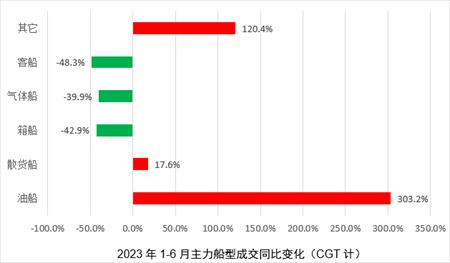 油船夺得半年成交冠军,船型轮动的趋势明显。上半年,成交船型以CGT计的份额占比从高至低依次为油船(23%)、气体运输船(21%)、集装箱船(21%)、散货船(20%)、其它船舶(14%)以及客船(1%)等。油船、特种船舶(其它船舶)市场上半年成交量大幅增加。其中,油船涨幅达到303%,对新造船市场的贡献最大,也超过气体船和集装箱船成为半年的成交冠军;特种船舶市场在汽车运输船的加持下涨幅也是十分明显。两种主力船型的表现符合之前的预期。而散货船同比17.6%的涨幅则带来不小“惊喜”,说明下游运费收益的好坏已经不是决定新造船市场的唯一因素。