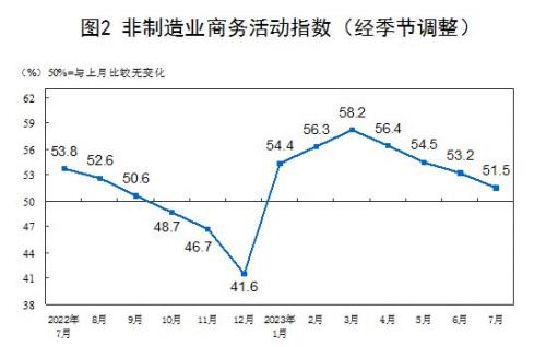 7月份,非制造业商务活动指数为51.5%,比上月下降1.7个百分点,仍高于临界点,非制造业继续保持扩张。