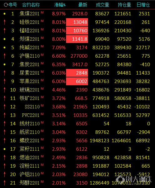 9月22日,期市收盘涨多跌少,煤炭板块大涨,焦煤(2928, 241.00, 8.97%)主力合约一度涨停,收涨8.97%,硅铁(13048, 968.00, 8.01%)、锰硅(10760, 798.00, 8.01%)主力合约涨停,涨幅为8.01%,动力煤(1142, 84.60, 8.00%)主力合约涨停,涨幅8%,纯碱主力合约涨超7%,沪锡(277000, 17160.00, 6.60%)、焦炭(3417, 204.00, 6.35%)主力合约涨超6%,尿素主力合约涨停,涨幅6.03%,苹果(6002, 340.00, 6.00%)主力合约涨停,涨幅6%;跌幅方面,生猪主力合约跌超5%,20号胶、橡胶(13300, -480.00, -3.48%)、沥青(3124, -110.00, -3.40%)、沪铅(14220, -440.00, -3.00%)主力合约跌超3%。