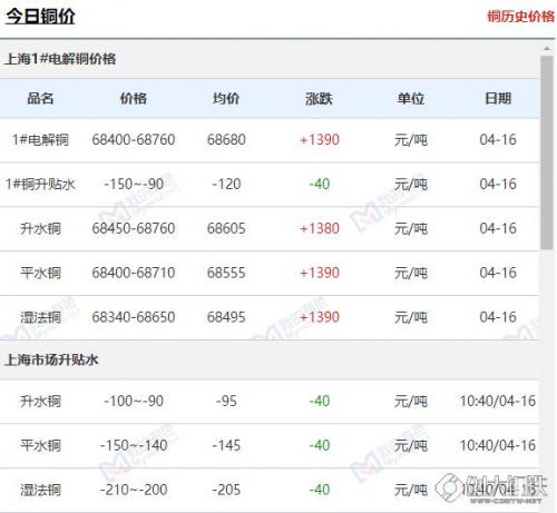 4月16日,上海地区1#电解铜现货成交价格68680元/吨,涨1390元/吨;报价贴水150~贴水90元/吨,平水铜升贴水较昨日跌40元/吨。