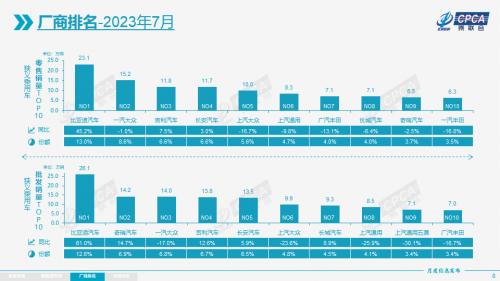4)车企:7月新能源乘用车企业总体走势较强,比亚迪纯电动与插混双驱动夯实自主品牌新能源领先地位;以长安、上汽、广汽、吉利等为代表的传统车企在新能源板块表现尤为顽强。在产品投放方面,随着自主车企在新能源路线上的多线并举,市场基盘持续扩大,厂商批发销量突破万辆的企业达到15家(环比增加2家,同比减少1家),占新能源乘用车总量88.1%(上月82.7%,去年同期83.4%)。其中:比亚迪261,105辆、特斯拉中国64,285辆、广汽埃安45,025辆、吉利汽车41,014辆、长安汽车36,897辆、上汽通用五菱34,531辆、理想汽车34,134辆、长城汽车28,896辆、上汽乘用车23,750辆、蔚来汽车20,462辆、零跑汽车14,335辆、上汽大众13,378辆、小鹏汽车11,008辆、哪吒汽车10,039辆、上汽通用10,021辆。