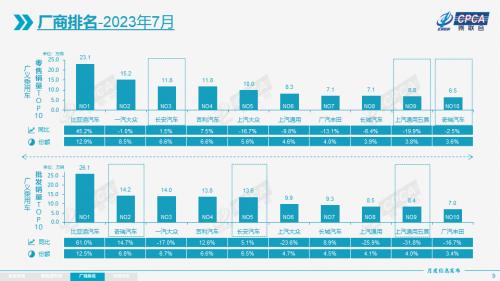 7月自主品牌零售94万辆,同比增长15%,环比增长1%。2023年7月自主品牌国内零售份额为53.2%,同比增长5.8个百分点;2023年自主品牌累计份额50%,相对于2022年同期增加4.4个百分点。7月自主品牌批发市场份额58.1%,较去年同期增8.3个百分点;自主品牌在新能源市场和出口市场获得明显增量,头部传统车企转型升级表现优异,比亚迪汽车、吉利汽车、长安汽车、奇瑞汽车等传统车企品牌份额提升明显。