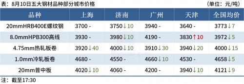 ◎9月份宝武基价继续上调。其中,厚板、热轧等基价上调100;酸洗、无取向、普冷等基价上调150;热镀锌、低铝锌铝镁、电镀锌等基价上调200;镀铝锌、中锌铝镁、高铝锌铝镁、彩涂等基价上调150。