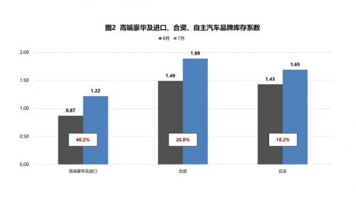 高端豪华及进口品牌库存系数为1.22,环比上升40.2%;合资品牌库存系数为1.89,环比上升26.8%;自主品牌库存系数为1.69,环比上升18.2%。