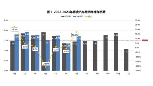2023年8月10日,中国汽车流通协会发布2023年7月份“汽车经销商库存”调查结果:7月份汽车经销商综合库存系数为1.70,环比上升25.9%,同比上升17.2%,库存水平在警戒线以上。