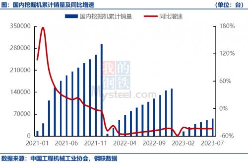 从国内外市场来看,7月国内挖掘机销量5112台,同比下降44.7%;出口7494台,同比下降13.8%。中国挖掘机出口结束了高增长趋势,已连续两个月下滑。1-7月,内销累计56143台,同比下降44.1%;出口累计65281台,同比增长7.62%。内销累计同比增速已连续21个月负增长。