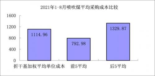 1-8月对标企业喷吹煤平均采购成本最低的前5家企业折算成干基的加权平均采购成本为792.98元/吨,比对标企业平均采购成本低321.98元/吨,低于平均采购成本28.88%;而采购成本最高的5家企业的加权平均采购成本为1329.87元/吨,比对标企业平均采购成本高214.92元/吨,高于平均采购成本19.28%。