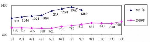 对标企业炼焦煤8月份加权平均折算成干基的采购成本为1865.88元/吨,环比升高170.35元/吨,升幅为10.05%。1-8月累计平均折算成干基的采购成本为1504.47元/吨,同比升高267.76元/吨,升幅为21.65%。
