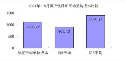 1-8月对标企业国产铁精矿折算成62%品位的平均采购成本为1117.89元/吨,成本最低的前5家企业的加权平均采购成本为901.13元/吨,比对标企业平均采购成本低216.77元/吨,低于平均采购成本19.39%;而采购成本最高的5家企业的加权平均采购成本为1395.13元/吨,比对标企业平均采购成本高277.23元/吨,高于平均采购成本24.80%。