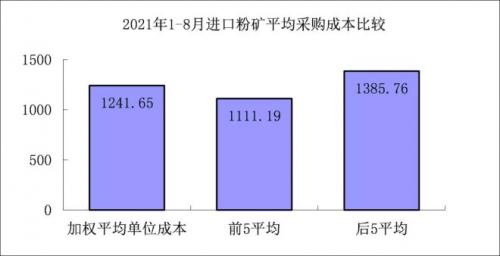 1-8月对标企业进口粉矿折算成62%品位的平均采购成本为1241.65元/吨,成本最低的前5家企业的加权平均采购成本为1111.19元/吨,比对标企业平均采购成本低130.46元/吨,低于平均采购成本10.51%;而采购成本最高的5家企业加权平均采购成本为1385.76元/吨,比对标企业平均采购成本高144.10元/吨,高于平均采购成本11.61%。