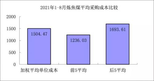 1-8月对标企业炼焦煤平均采购成本最低的前5家企业折算成干基的加权平均采购成本为1236.03元/吨,比对标企业平均采购成本低268.43元/吨,低于平均采购成本17.84%;而采购成本最高的5家企业的加权平均采购成本为1693.61元/吨,比对标企业平均采购成本高189.14元/吨,高于平均采购成本12.57%。