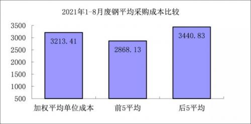 1-8月对标企业废钢平均采购成本最低的前5家企业的加权平均采购成本为2868.13元/吨,比对标企业平均采购成本低345.27元/吨,低于平均采购成本10.74%;而采购成本最高的5家企业加权平均采购成本为3440.83元/吨,比对标企业平均采购成本高227.42元/吨,高于平均采购成本7.08%。