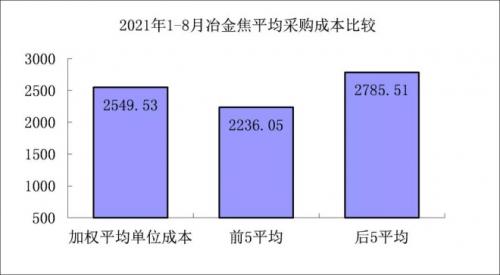 1-8月对标企业冶金焦平均采购成本最低的前5家企业的加权平均采购成本为2236.05元/吨,比对标企业平均采购成本低313.48元/吨,低于平均采购成本12.30%;而采购成本最高的5家企业的加权平均采购成本为2785.51元/吨,比对标企业平均采购成本高235.97元/吨,高于平均采购成本9.26%。