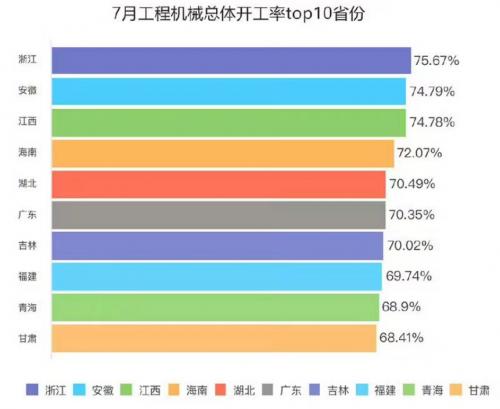 从设备开工率开看,7月,全国路面设备总体开工率创今年新高。其中青海、吉林、北京、湖北、重庆、陕西、浙江、贵州、西藏9个省份开工率也再创新高,分别达到77.00%、68.40%、67.88%、66.44%、65.00%、64.43%、64.29%、49.60%、44.75%。
