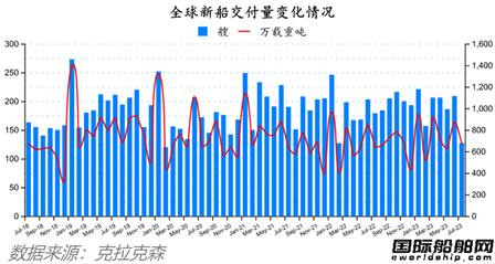 从船型来看,散货船的交付数量为32艘,共计2569056载重吨;集装箱船的交付数量为27艘,共计213039TEU;油船的交付数量为10艘,共计886104载重吨;化学品船的交付数量为3艘,共计18732载重吨;液化气船交付数量为11艘,共计1075000立方米;海工船交付数量为24艘,共计263196载重吨;其他船型交付数量为20艘,共计99878载重吨。