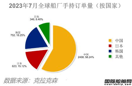 按接单船厂国家来看,7月份全球新船订单106艘,合计3400657CGT,其中中国船厂接获50艘,合计1183205CGT;日本船厂接获11艘,合计614675CGT;韩国船厂接获29艘,合计1464497CGT。修正总吨分别占全球新船订单量的34.79%、18.08%和43.07%。