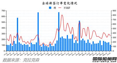 根据克拉克森最新数据统计(截至2023年8月7日),2023年7月份全球新签订单106艘,共计3,400,657CGT。与2023年6月份全球新签订单150艘,共计3,790,884CGT相比较,数量环比减少44艘,修正总吨环比下降10.29%。与2022年7月份全球新签订单139艘,共计2704393CGT相比较,数量同比减少33艘,修正总吨同比上升25.75%。