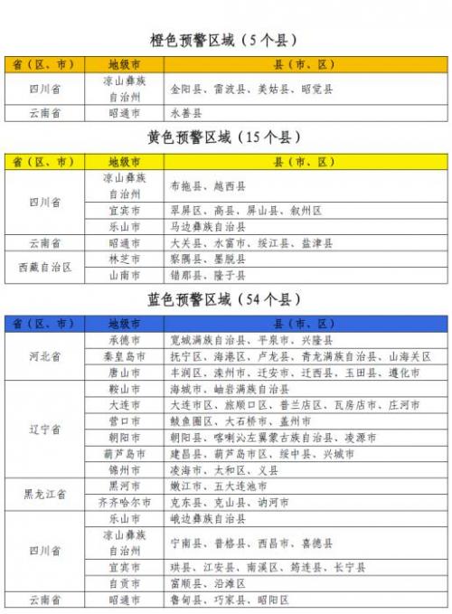 据水利部官方微信消息,水利部和中国气象局8月20日18时联合发布橙色山洪灾害气象预警。预计,8月20日20时至8月21日20时,四川东南部、云南东北部、西藏东南部等地部分地区发生山洪灾害可能性较大(黄色预警),其中,四川东南部、云南东北部局地发生山洪灾害可能性大(橙色预警),预警区域涉及的县(市、区)见下表。其他地区也可能因局地短历时强降水引发山洪灾害,请各地注意做好实时监测、防汛预警和转移避险等防范工作。