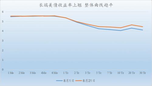 截至21日收盘,2年期美债的收益率从上周五的4.92%上升5BPs至4.97%,据美国财政部数据,周一的水平是7月6日以来的最高水平。10年期美债收益率从上周五下午的4.26%跃升8BPs至4.339%,为2007年11月6日以来的最高水平。30年期美债收益率从上周五尾盘的4.38%上升7BPs至4.45%,为2011年4月27日以来的最高水平,当时达到4.462%。