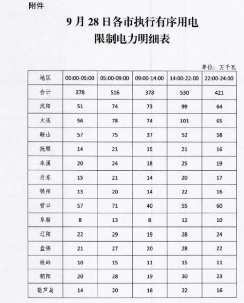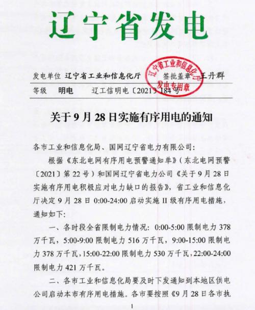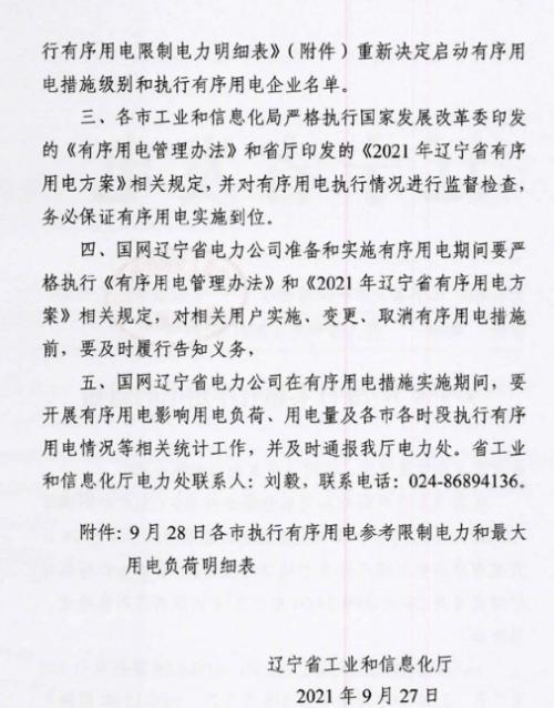 9月28日,辽宁工信厅发布关于9月28日实施有序用电的通知,具体内容如下: