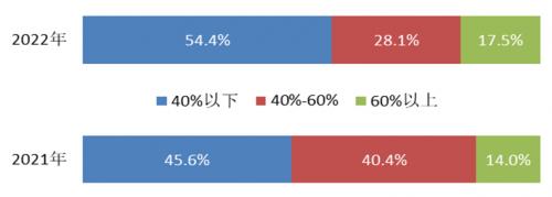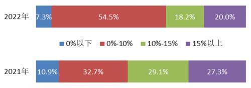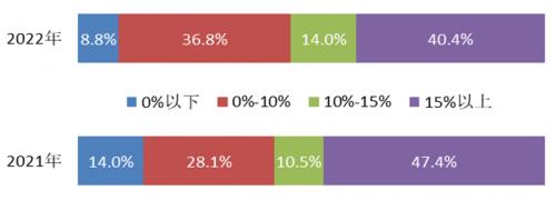 从利润率的分布看,2022年度利润率在0%以下的企业占8.8%,占比下降5.3个百分点;位于0%-10%之间的企业占36.8%,占比上升8.8个百分点;位于10%-15%之间的企业占14.0%,占比上升3.5个百分点;位于15%以上的企业占40.4%,占比下降7.0个百分点。整体分布明显往中间两个区域集中。利润率的整体分布情况见图4。