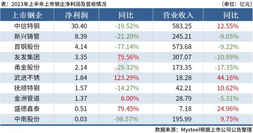 据Mysteel不完全统计,截至8月23日,已有10家上市钢企公布2023年上半年业绩报告,合计营业收入约2175.01亿元,合计净利润约53.74亿元。