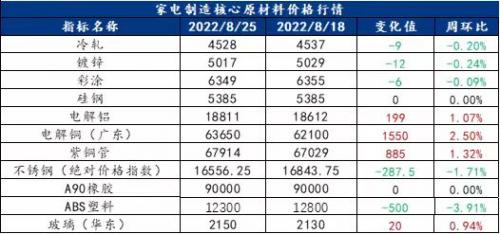 截止2023年8月25日,各原材料当日即时价格以及价格周环比情况如下: