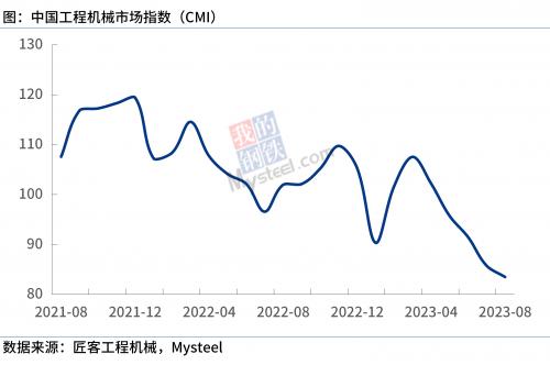 匠客工程机械最新数据显示,2023年8月份,中国工程机械市场指数即CMI为83.45,同比降低18.13%,环比降低2.65%。依据CMI判断标准,7月指数继续处于收缩值100以下,市场情绪比较悲观,降幅可能加剧,警惕市场下行风险累积。