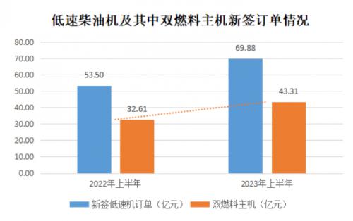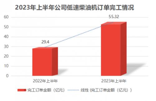 中国动力低速柴油机手持订单饱满,2023年上半年生产负荷及销售量明显高于同期,为了保质保量的完成交付任务,公司统筹协调各方资源,实现交付低速机188台,完工订单55.32亿元、完工订单金额同比增长88.14%,较好的完成了上半年交付任务。另外,随着低碳动力船舶订单份额提升,为了抢抓市场机遇公司多次拜访船东和设计院所,主动推介低碳燃料主机及低碳动力成套装备产品,低碳产品订单大幅提升。报告期内新签低速机订单69.88亿元,同比增长30.61%,其中双燃料主机43.31亿元,同比增长32.81%;并取得甲醇燃料主机取得批量订单,实现零的突破。