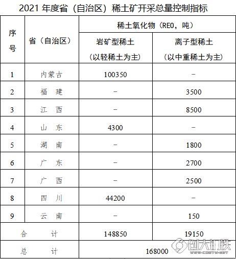2021年度全国稀土矿(稀土氧化物REO,下同)开采总量控制指标为168000吨,其中岩矿型稀土矿(以轻稀土为主)指标148850吨,离子型稀土矿(以中重稀土为主)指标19150吨。