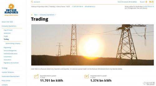 俄罗斯国际统一电力进出口公司2020年共出口电力117.01亿千瓦时,进口电力约13.74亿千瓦时。(图片来源:公司官网)