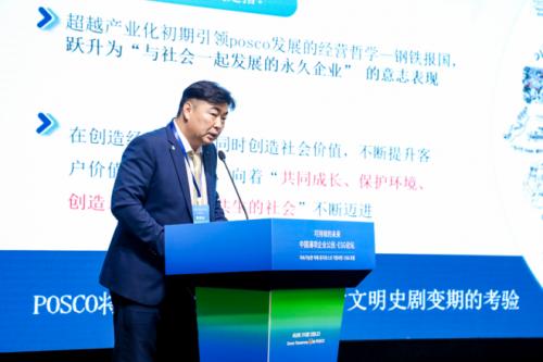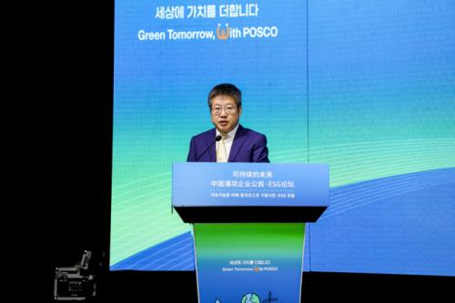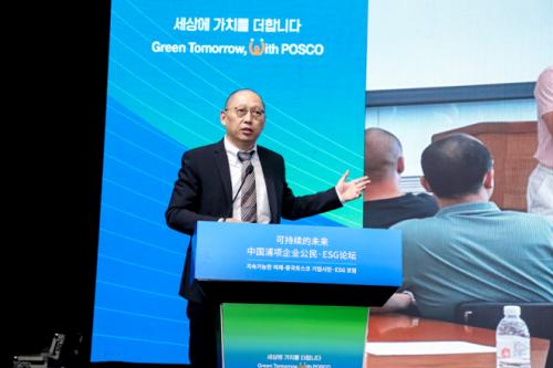 POSCO ESG Group负责人朴正奭发表致辞,他承诺,“浦项将以‘负责任的企业公民’形象,切实履责,与此同时为与其他企业携手并进,努力成为未来经营先导者”。