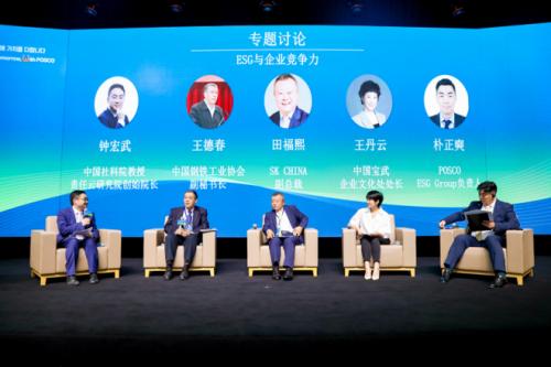 颁奖仪式结束后,会议进入“专题讨论”环节,此次讨论以“ESG与企业竞争力”为主题,由中国社科院教授、责任云研究院创始院长钟宏武主持,中国钢铁工业协会副秘书长王德春、SK中国副总裁田福熙、宝武集团企业文化处处长王丹云、浦项集团POSCO ESG Group负责人朴正奭四位嘉宾参与讨论。