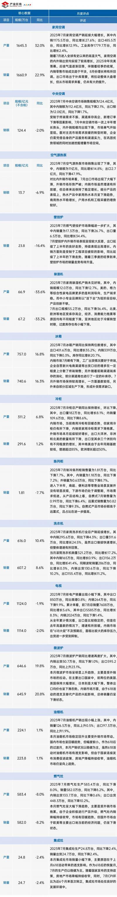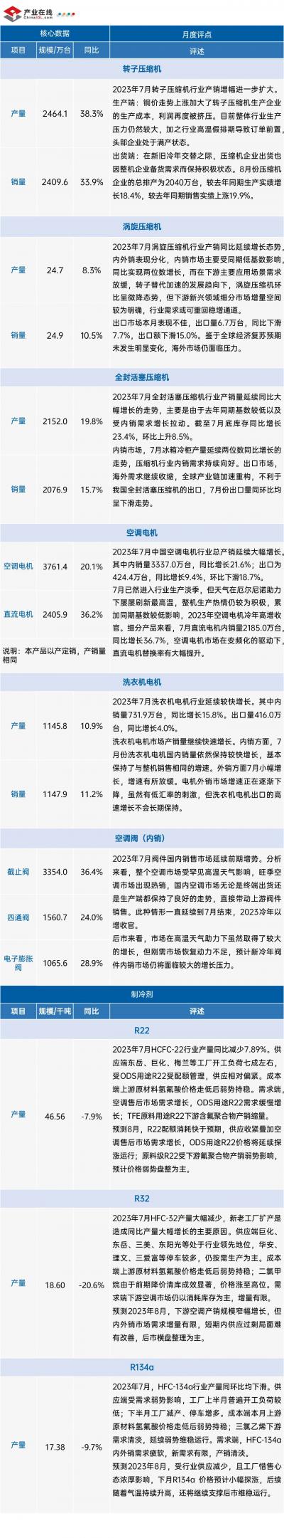 据产业在线最新月度数据显示,2023年7月份的产业链市场出现了较大分化,家用空调和制冷产业总体增势良好,尤其是家用空调上下游都增幅可观;中央空调、空气源热泵、制冷剂等市场出现了不同程度的下滑;厨电产品涨跌互现。