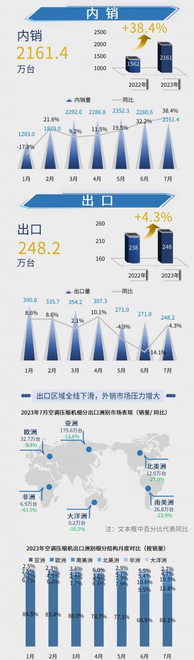 2023年7月转子压缩机行业生产2464.1万台,同比上升38.3%,环比下滑2.8%;销售2409.6万台,同比上升33.9%,环比下滑5.6%。