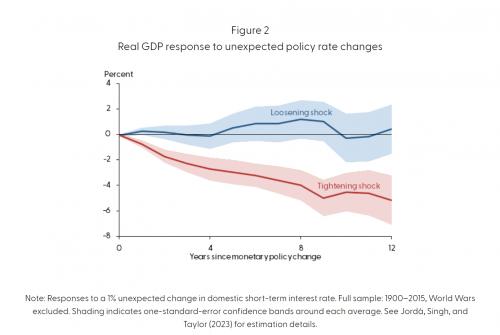 他们发现,在其他所有经济因素相同的情况下,货币政策冲击“会比人们普遍认为的更持久地减缓经济活动的步伐”。