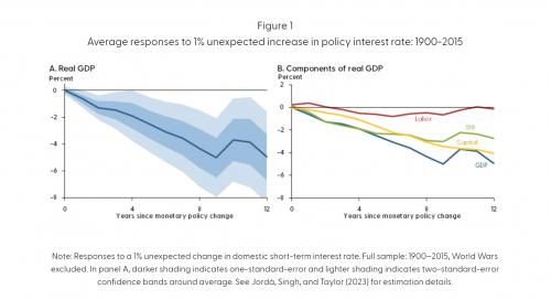 例如,研究人员发现,如果利率上调1%,12年后实际国内生产总值(GDP)将较利率未调整的情况低5%左右。