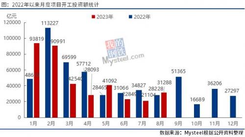 据Mysteel不完全统计,2023年8月,全国各地共开工5709个项目,环比增长68.21%;总投资额约31287.65亿元,环比增长48.25%;前8月合计总投资约37.18万亿元。
